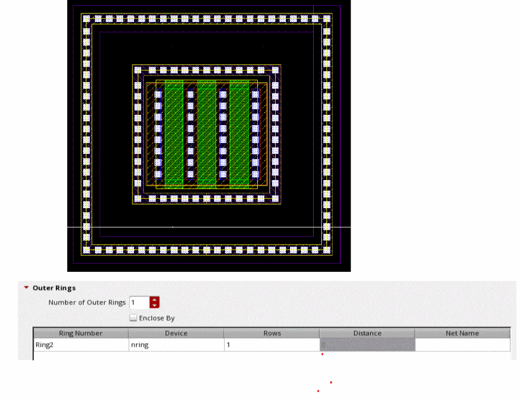 The new Create Guard Ring functionality also supports advanced constraints that ensure creation of a DRC-compliant guard ring by getting the correct contact spacing from the appropriate constraint. Additionally, the .xfgrRules file lets you override constraint precedence, updating the default values of the device parameters, and adding the attributes to enable the auto FGR functionality without updating the technology file.
