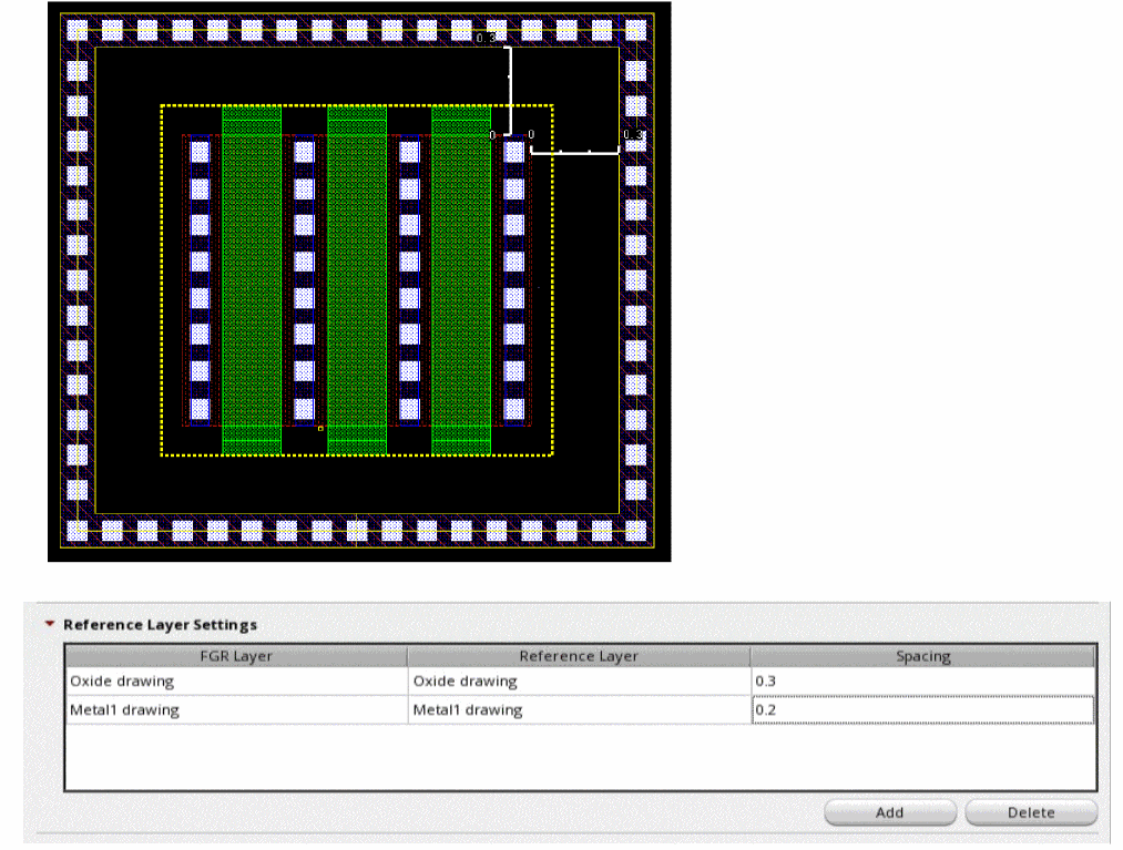 minSpacingrule defined for the object layers, which include both original and derived layers, should be used to compute the spacing between the FGR and the object. - Reference Layer: Lets you create the FGR around a selected set of objects by specifying the spacing between a pair of layers. When you choose the Reference Layer option you define the layer list and the spacing value to be maintained for the specified layer pair.