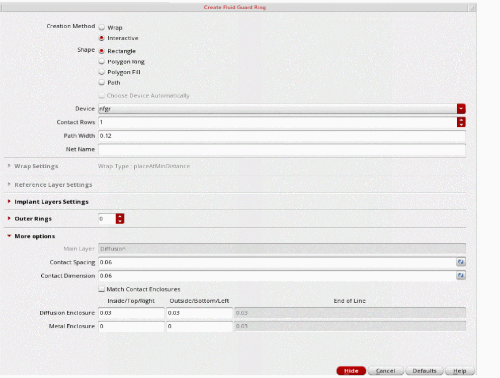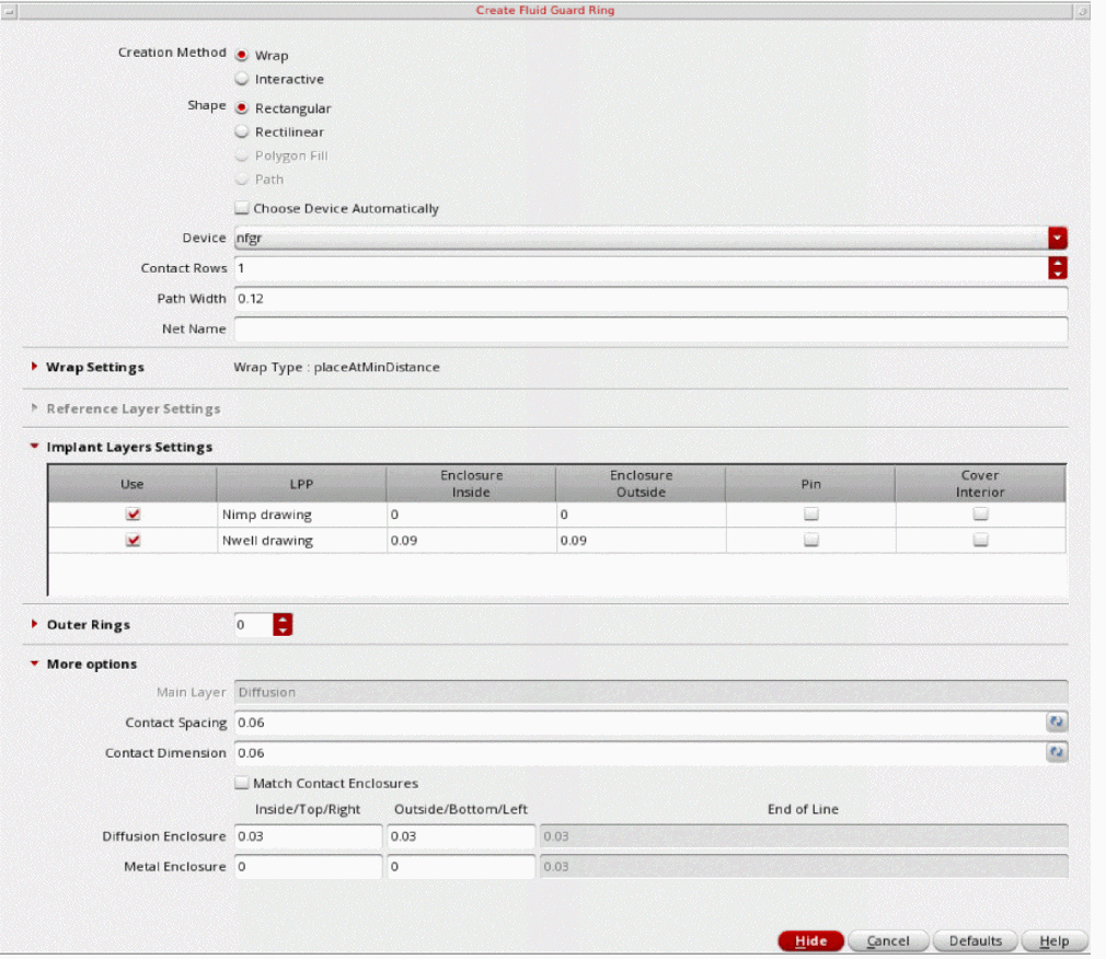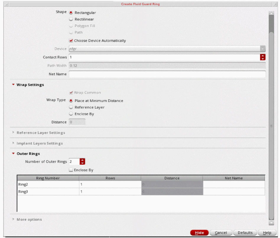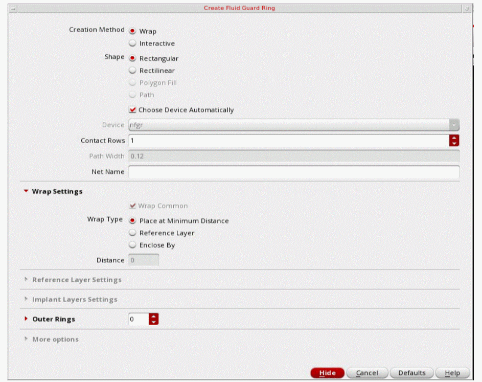 You can create fluid guard rings using the new GUI, Create Fluid Guard Ring Form (New GUI), which offers enhanced usability with a simplified and user-friendly interface which is a single-page GUI with intuitive option categorization. You can also specify the asymmetric enclosure for FGR layers. This functionality requires adding new FGR devices using the Install Guard Ring form.
