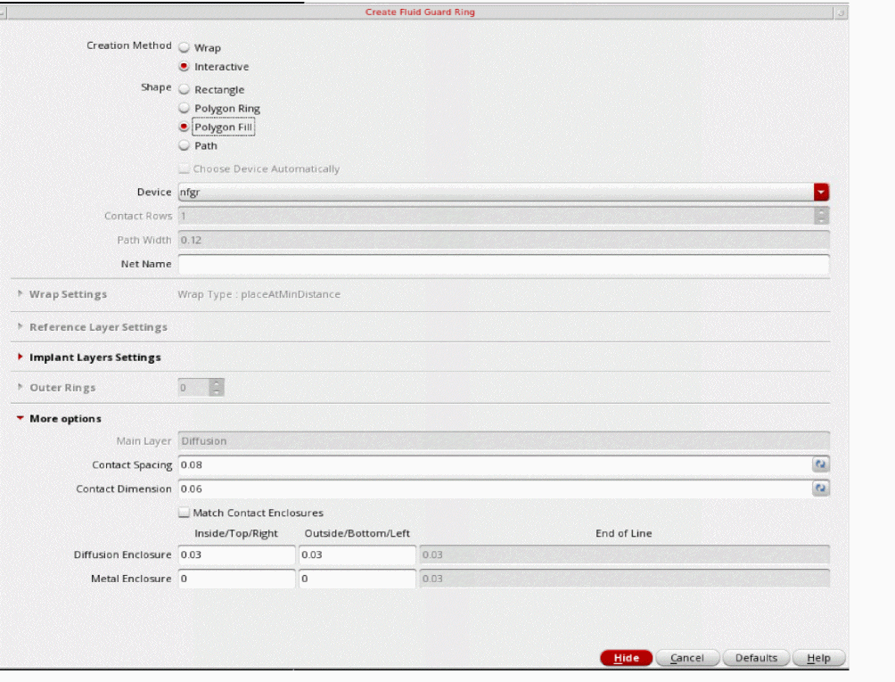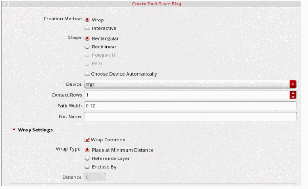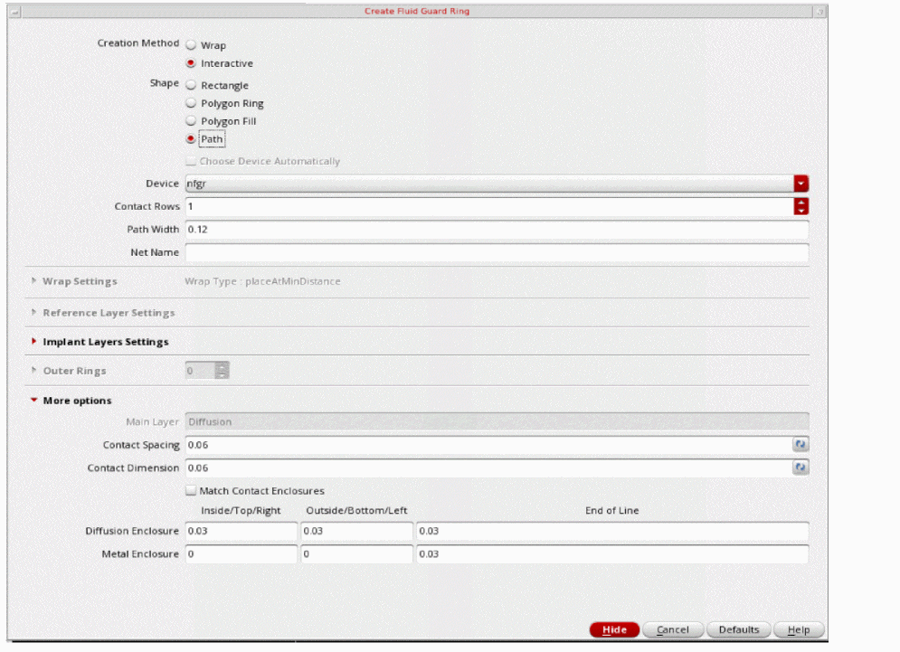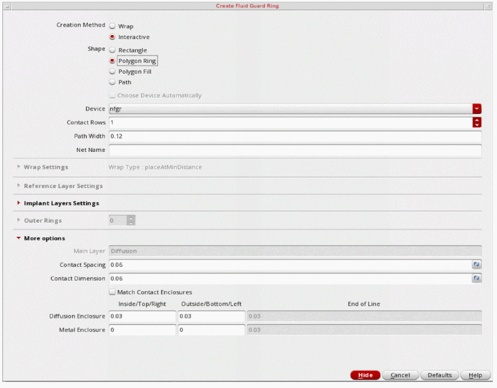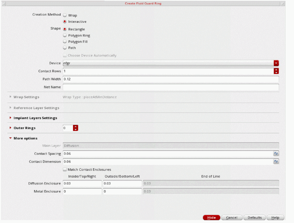 You can create fluid guard rings using the new GUI, Create Fluid Guard Ring Form (New GUI), which offers enhanced usability with a simplified and user-friendly interface which is a single-page GUI with intuitive option categorization. You can also specify the asymmetric enclosure for FGR layers. This functionality requires adding new FGR devices using the Install Guard Ring form.