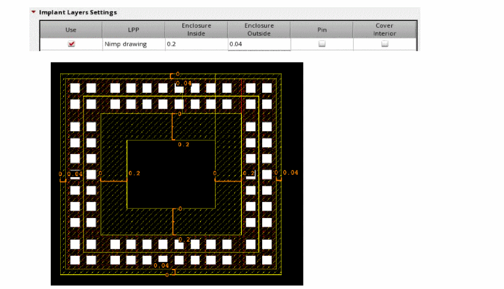 gpdk045withOxide,cont, andMetal1as the layers (diffusion, contact, and metal respectively), andNWellas the implant. The minimum enclosure of Nwell over diffusion (Oxide) in the technology file is0.09. Despite this, you can install the FGR device0.06(with a warning message). -