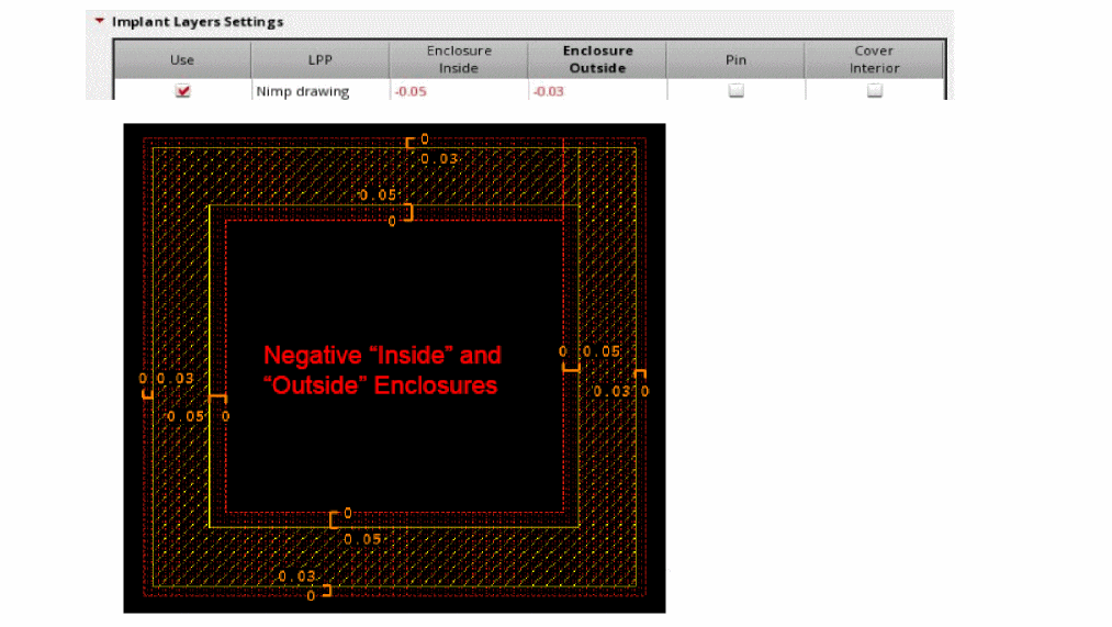 You can specify negative and different values for inside and outside enclosures of implant or well layers with respect to diffusion as shown in the figure below.