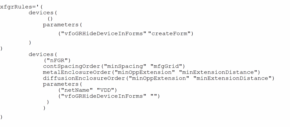 You can use the .xfgrRules file to override the default values specified in the Install Guard Ring form for fluid guard ring devices. The .xfgrRules file is saved in the technology library. You can use .xfgrRules file to setup new functionalities, such as Auto FGR, and hide FGR devices from the Create Guard Ring form. You can also use this file to define device parameter defaults and constraints precedence order.