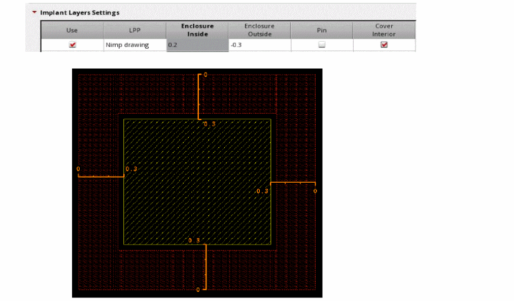 You can specify negative values for outside enclosures of implant or well layers with respect to diffusion so that they are retracted inside the diffusion shape as shown in the figure below. In this case, the Cover option is selected.