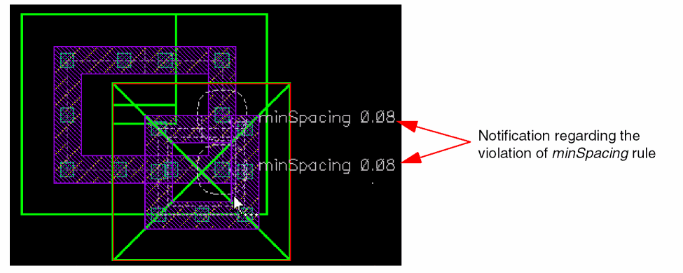 Use the DRD Options form to enable the Enforce, Notify, or Post Edit mode at the current cellview, current to bottom, current to stop level, or current to user level hierarchy depth. The following image illustrates annotations to indicate the violation of the minimum spacing (minSpacing) rule. This notification is displayed if the minSapcing constraint is selected for Notify mode under the Filters tab of the DRD Options form.