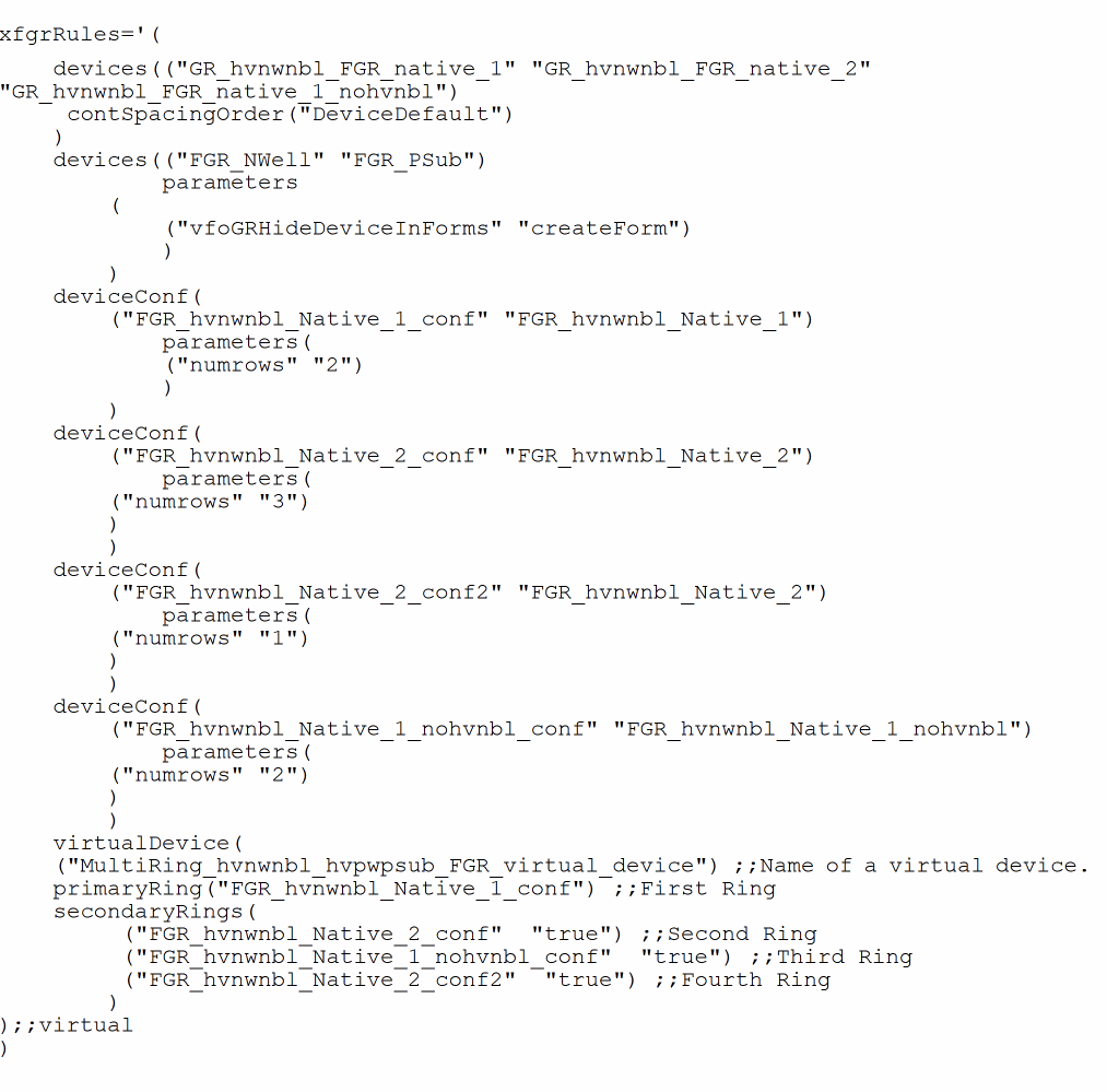 If you want to create a multi-ring fluid guard ring device, define the virtualDevice section in the .xfgrRules file.