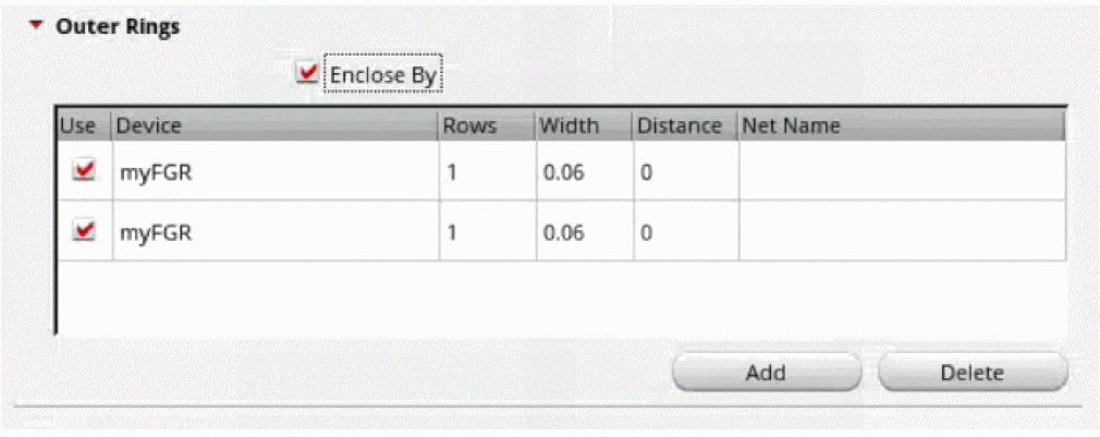 If you enable the XFGR_ENHANCED_OUTERRING_ SUPPORT Shell environment variable, the Use and Width columns are displayed in the table in the Outer Rings section of the Create Fluid Guard Ring Form (New GUI). The Use field lets you select the device in the table while creating outer rings. The Width field displays the width of the outer ring.