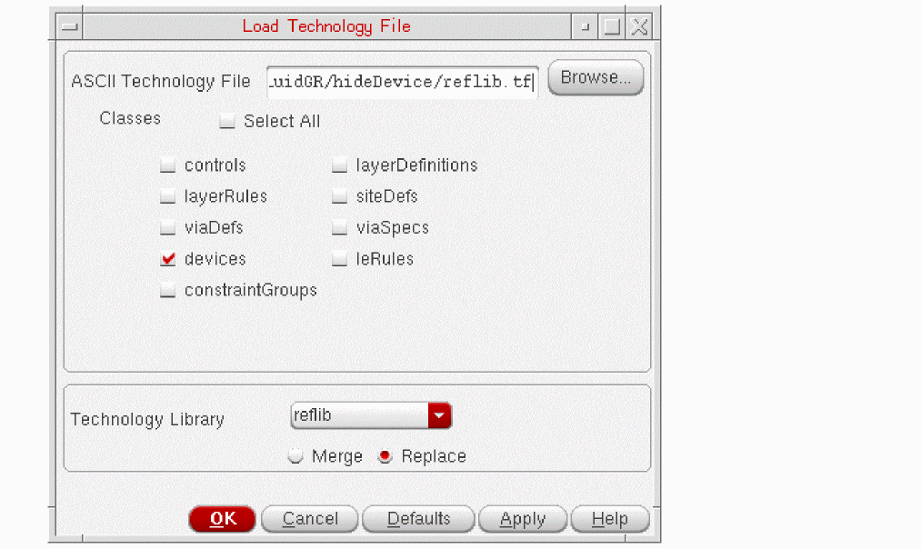 Suppose you have a technology file reflib.tf that contains definitions for the following devices: LRing, hideFromCreate1, hideFromCreate2, hideFromCreateInstall, hideFromInstall1, and hideFromInstall2.