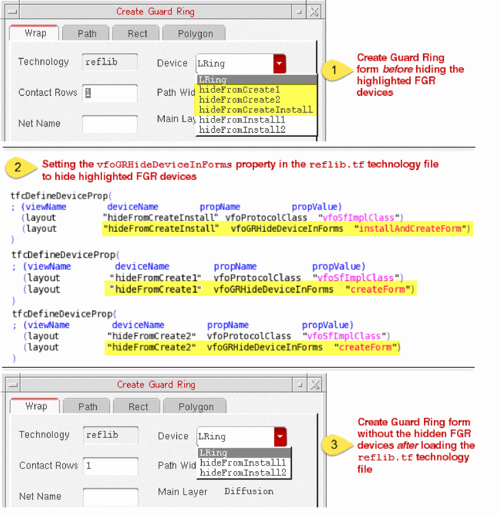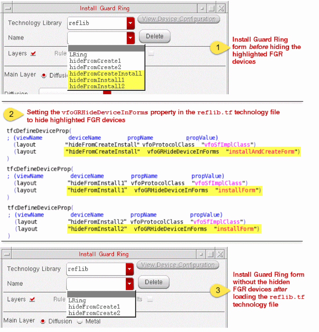 To make a previously hidden FGR device visible on either the Install Guard Ring form or the Create Guard Ring form, remove the associated vfoGRHideDeviceInForms property from the technology file and then reload the file in Virtuoso.