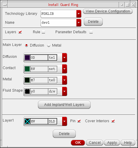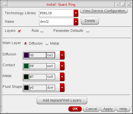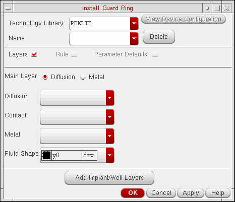 If you are creating a new FGR, the Diffusion, Contact, and Metal lists are blank. Until you set up these layers, the Rule and Parameter Defaults check boxes, and the View Device Configuration button remain grayed out.It is mandatory to set up the Diffusion, Contact, and Metal layers and optional to set up the Implant/Well layers.- Select either the Diffusion or Metal radio button to define the Main Layer. By default, Diffusion is selected.