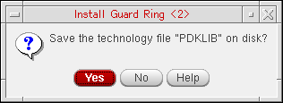 The Install Guard Ring dialog box appears to confirm whether you want to save the technology library on disk. If you click Yes, the FGR device is saved to the technology file in virtual memory and written to the technology library on disk. If you dump a technology file after installing the FGR, you will see the FGR definition in the corresponding technology file class.