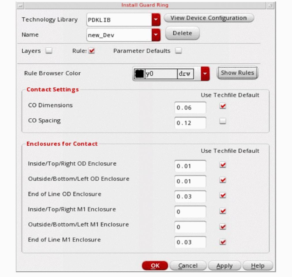 By default, the values in these fields are populated from the foundry constraint group in the technology file. If the values in the form match the default values from the technology file, the Techfile Default check box is on. You can override the defaults if required. If you do so, the Techfile Default check box turns off. Ensure that the diffusion and metal enclosure values are greater than technology library defaults.
