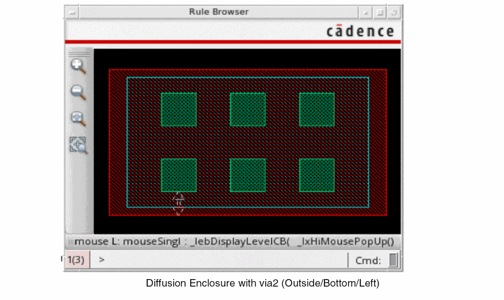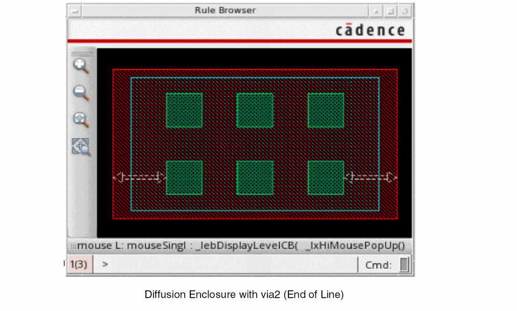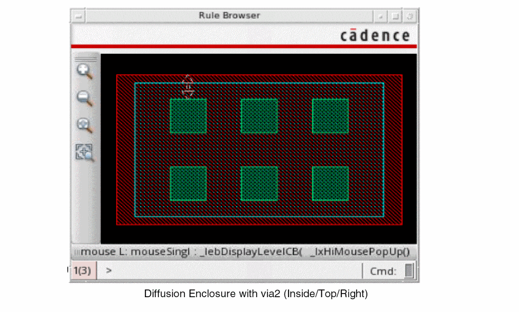 The following figures illustrate the contact dimensions, contact spacing, diffusion and metal layer enclosures over contact, and implant and well layer enclosures over diffusion rules of an FGR that comprises an implant and a well layer.