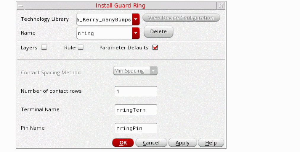 tech.db file. Also, if there is a data.dm file, it must be writable too. If the technology library is read only, then all the fields on the Install Guard Ring form are disabled and you cannot install any new device.To install an FGR, perform the following steps: