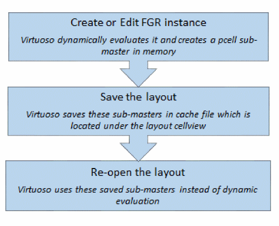 When you create or edit an FGR instance, the FGR sub-masters in the memory are saved to a cache when you save the layout cellview. The cache is located under the containing layout cellview. When you open the layout, Virtuoso uses these saved sub-masters from the cache, rather than dynamically evaluating them.