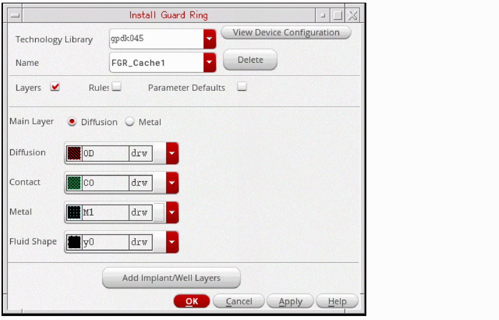 Fluid guard rings are SKILL/SKILL++ Pcells, with powerful creation and graphical editing capabilities. The Pcell code to evaluate them is located in the Virtuoso installation hierarchy. When you move to a different version of Virtuoso, geometry changes in existing FGR instances might occur, more details are described below. This can lead to issues as qualified designs that are already in production can change in a different release of Virtuoso and such designs would require re-qualification.