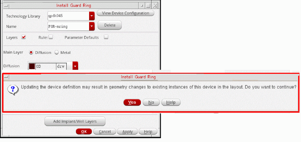 Re-installing an FGR device is the same as redefining a Pcell super-master. So, the geometries of existing FGR instances in the layout can change after re-installation of an FGR device. You get a warning message before continuing with the FGR re-installation, as shown in the figure below.