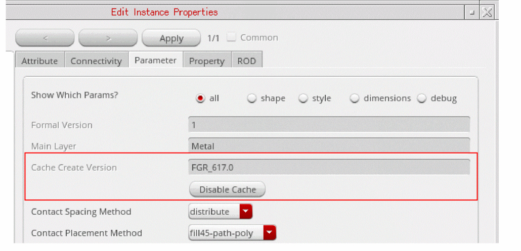 Even after the timestamp mismatch, by default, the sub-master would be read from the cache to create the instance geometry. To ignore the saved sub-master and create an FGR instance by evaluating it in the current Virtuoso version, you can use the Shell environment variable, FGR_CACHE_TIMESTAMP_CHECK.