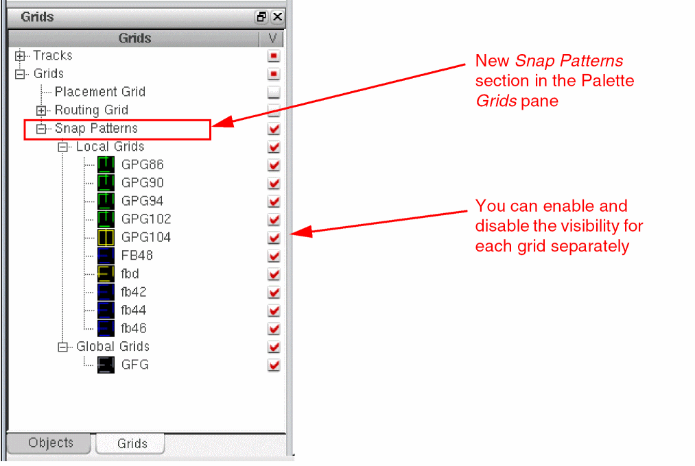 You control the visibility of local and global snap pattern grids on the Grids panel of the Palette assistant.