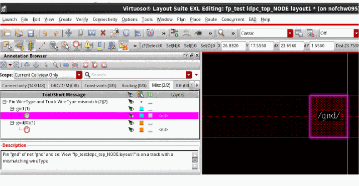 The figure below displays the highlighted nets with violation markers that have mismatched wire types.