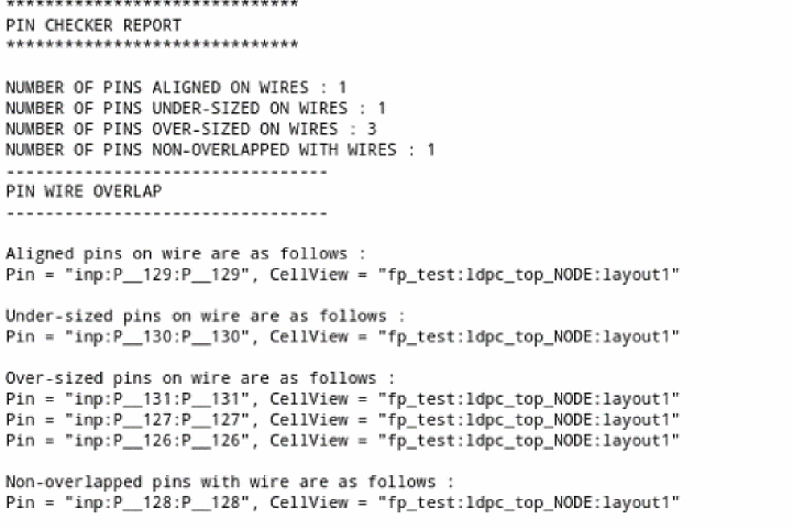 Checks if there is any physical overlap between pins and wires. This functionality can be run on all top-level and level-1 layout pins. You can view the markers generated for violating pins in the Annotation Browser.