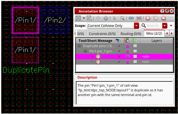 Checks for duplicate pins in the layout. This functionality can be run on all top-level and level-1 layout pins. You can view the markers generated for violating pins in the Annotation Browser.