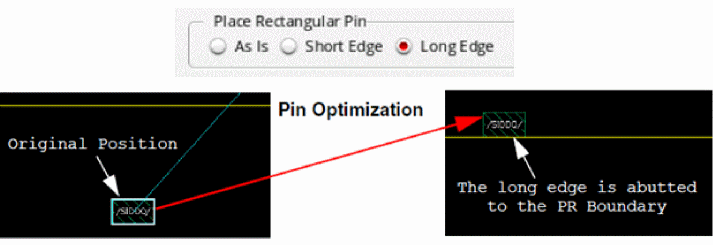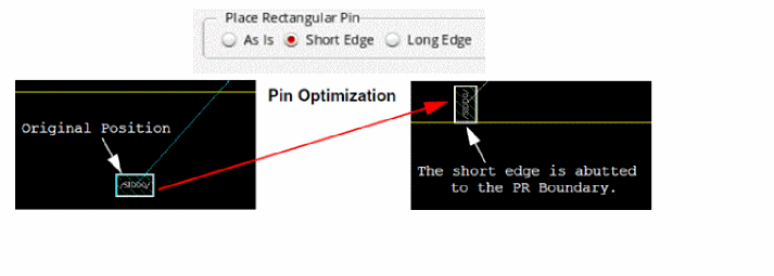 Abuts the rectangular pin as-is to the PR boundary, irrespective of whether the abutted edge is short or long during pin optimization. Depending on the original position of the pin and the PR boundary side, either the long edge or the short edge of the pin is abutted to the PR boundary. ![]() |