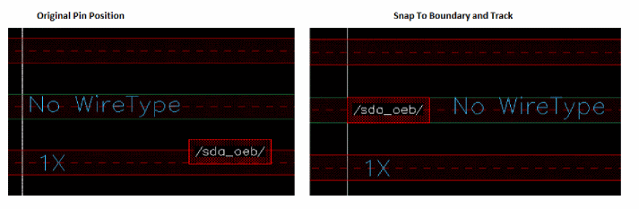 Snaps pins to the nearest WSP track without snapping them to the PR boundary. In this case, Layer Awareness and Width Awareness are disabled. Environment variable: pinSnapModeSnapPins |