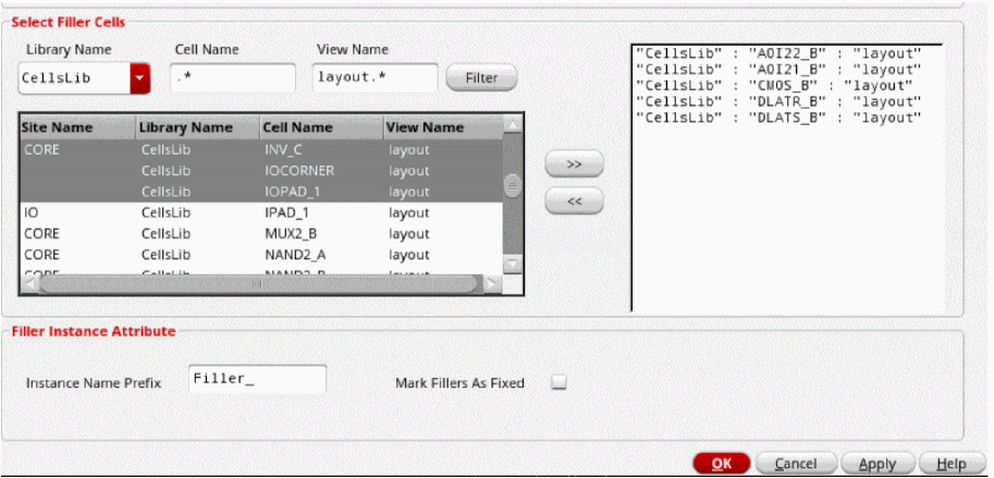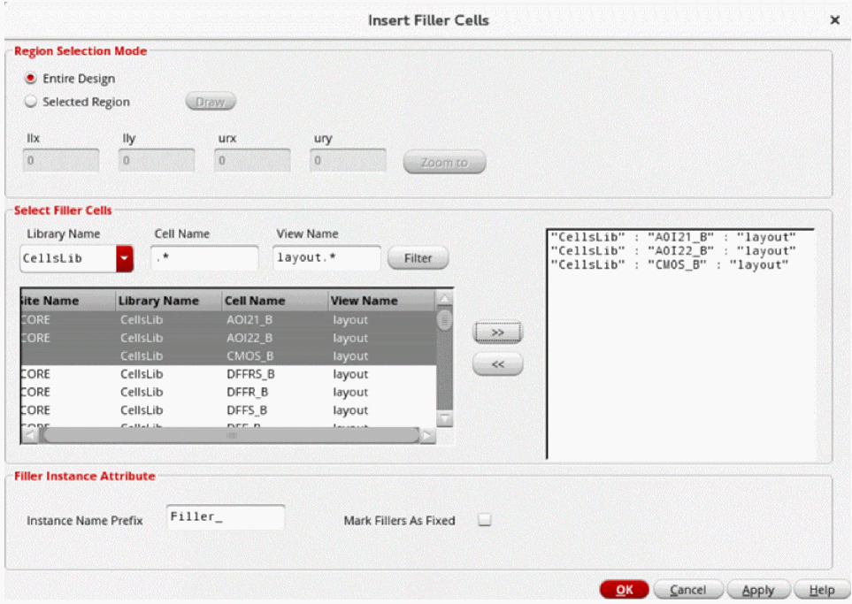 - Enable selection of few cells from entire range of libraries/cells/views using the Select Filler Cells section. The few selected cells would be used by the engine as filler cells.