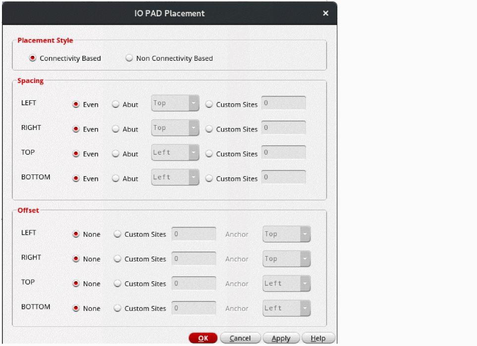- Custom Sites: Lets you define spacing in terms of the number of sites between adjacent IO PADs. The placement engine places IO PADs at these sites.You can set the spacing between cells by selecting the cells, creating an alignment constraint in the constraint manager, and setting the pitch value in the constraint.
