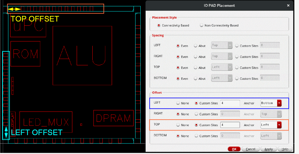 In the Offset section, define the position of the first IO PAD cell in each direction—LEFT, RIGHT, TOP, and BOTTOM.