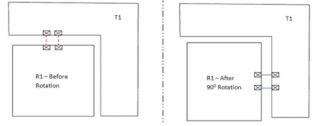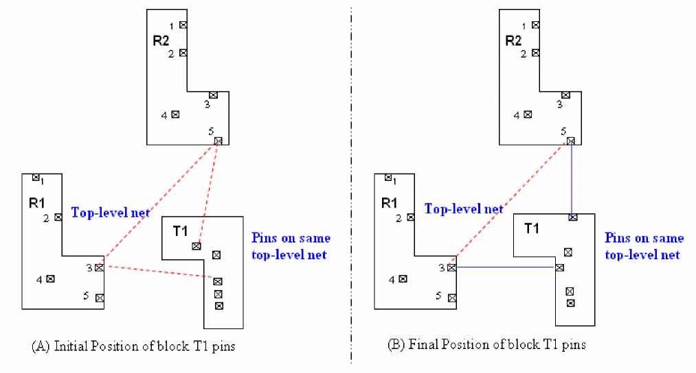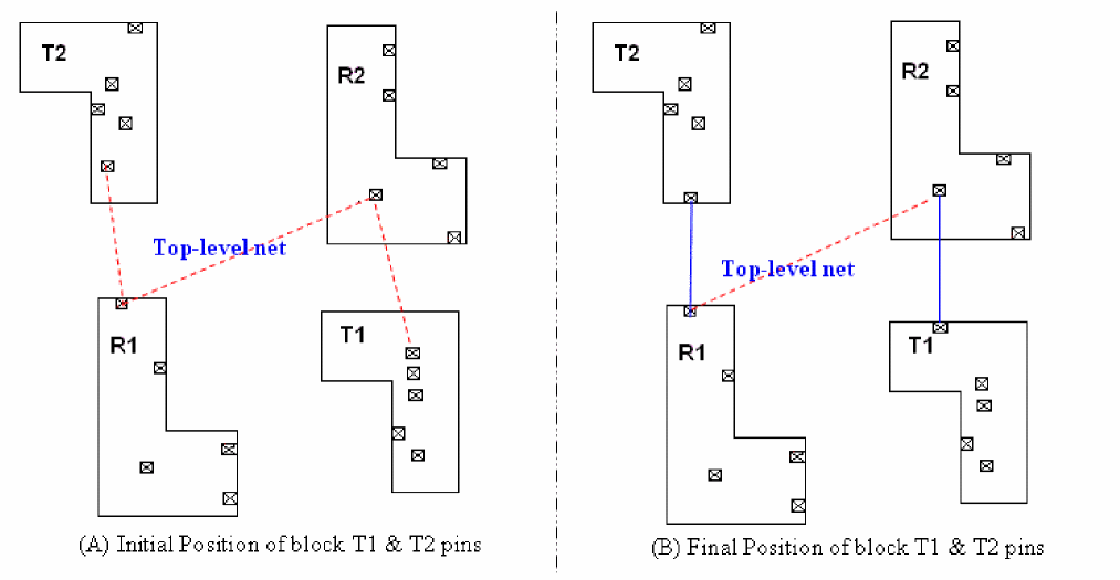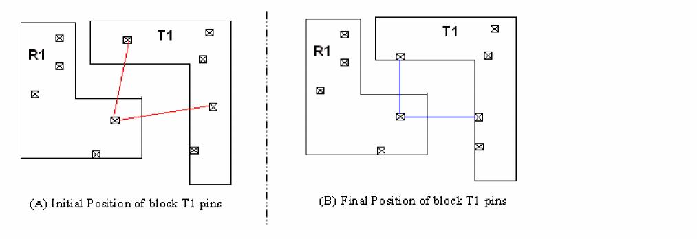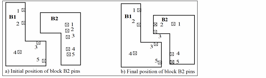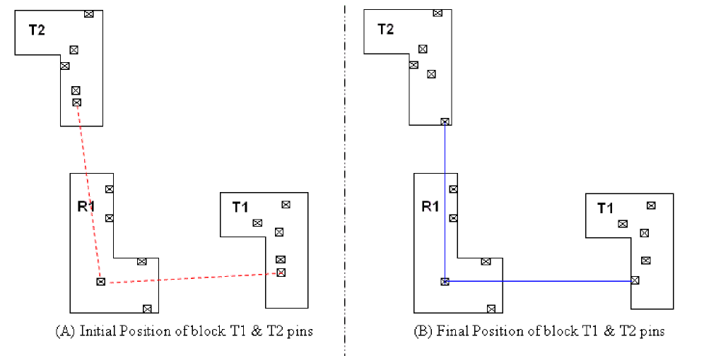 In this case, when the block having reference pins is rotated by 90o, the pin aligner automatically and intelligently aligns the pins in the target block with the pins in the reference block to get the shortest net length.
