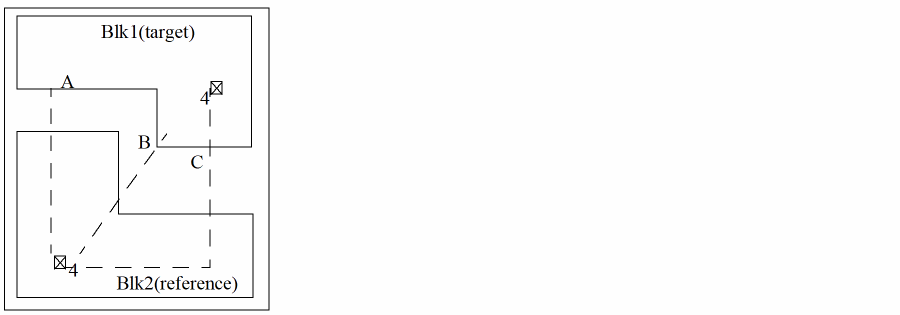 If a reference pin is not on the edge or is on the corner (and has two edges) then out of two orthogonal imaginary lines, the one that hits the target edge point (see example below) is considered and the connected target pin is moved to this point. This may not be the closest point. In this figure, Blk2 is the reference and Blk1 the target. Pin 4 needs to be aligned. If imaginary orthogonal lines are drawn from the reference pin 4 to the target, three possible positions can be identified for pin 4 on the target block. these are marked as A, B and C. The target pin can be moved to any of these positions. Pin aligner chooses position A for the target pin for the best alignment although positions B and C could have helped reduce the net length.