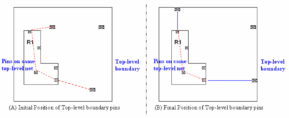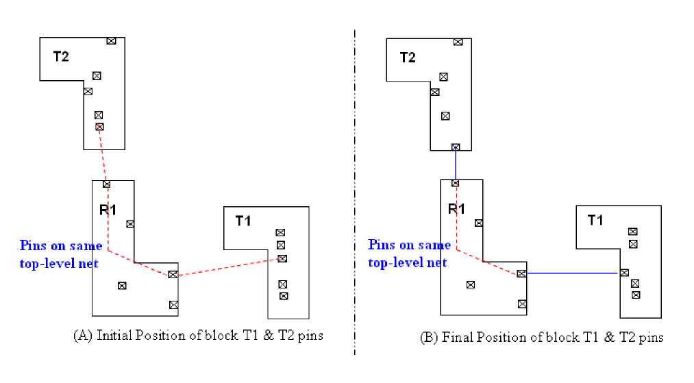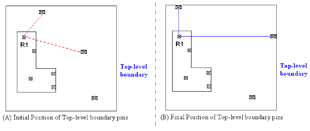 There are various cases in pin alignment some of which are described as follows. In the figures shown for various cases, the reference and target pins are shown as block pins but they can be top-level pins as well.