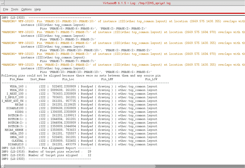 After aligning the pins, a Pin Alignment report is displayed in the CIW. The Pin Alignment report provides a detailed listing of target pins that are not aligned, along with the reason for not aligning them.