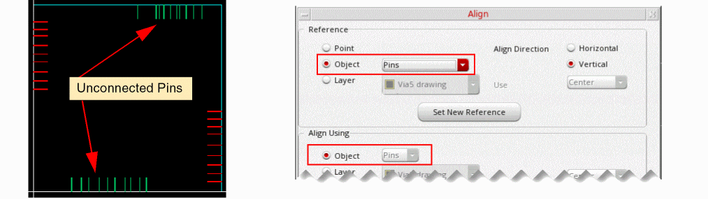 The Align command in the Align form lets you align unconnected bus pins. The selected target bus pins are aligned to the selected reference bus pins.