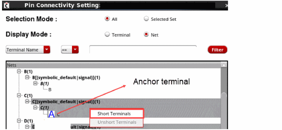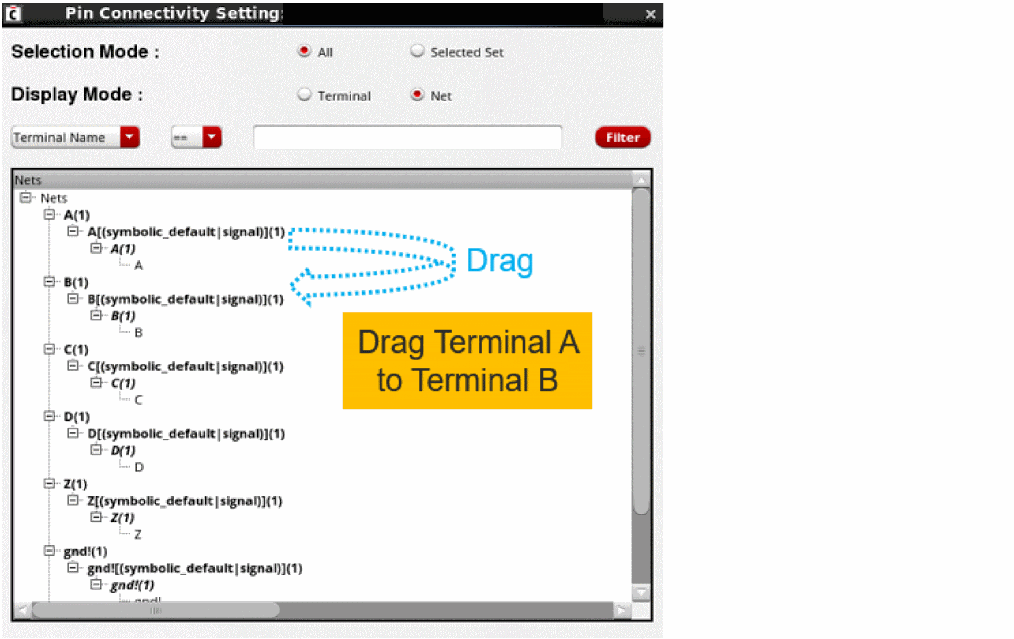 In this method, you drag the source terminal and drop it on the destination terminal or on its associated net. The source terminal is shorted with the destination terminal and it is listed under the destination net. The source net is considered an internal net, and it is not listed in the tree structure.