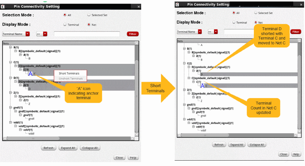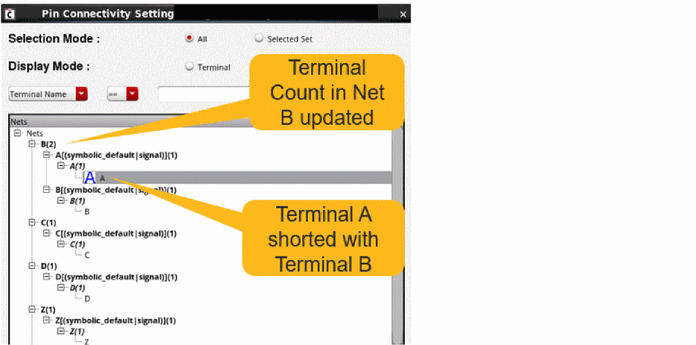 When terminal A is shorted with terminal B, the net name of terminal A is updated to net B. As a result, net A become an internal net as it contains zero terminals and is not displayed in the tree structure.