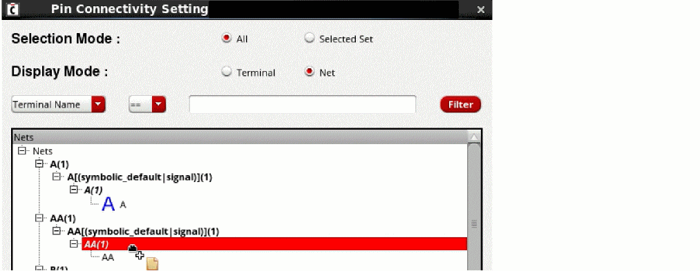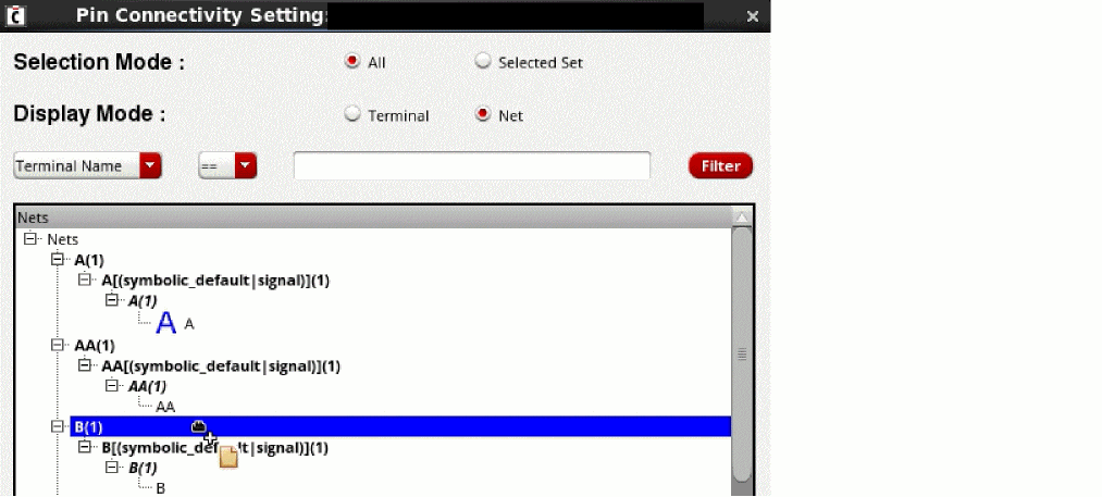 The drag and drop operation is assisted by the visual cues in the Pin Connectivity Setting form. When you start dragging a terminal, all valid destinations to drop it are dynamically highlighted in blue and all invalid destinations are highlighted in red. You can short terminals only at valid positions, which is indicated by blue. The valid position to drop a terminal is at the top of a net or on the top of another terminal. For example, you can drag terminal A and drop it on net B.
