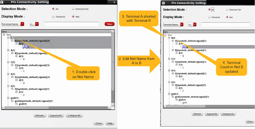 In this method, you edit the net name to short the terminals inside the net. If the modified net name is same as an existing net name, all the terminals, pins, and pin figures are moved from the target net to the destination net.