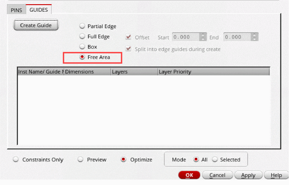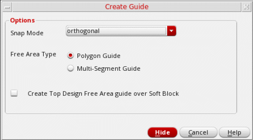 - Select Create Top Design Free Area guide over Soft Block to create top-level (level-0) guides over soft blocks. By default, if soft block pins are added on the Pins tab, then a level-1 guide is created.
