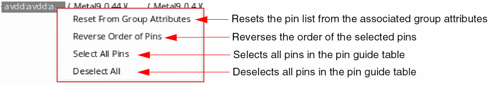 Select the required pins in the pin browser and right-click to display the shortcut menu, which provides the following options: