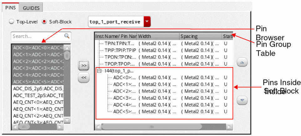 - Use the add (>>) or remove buttons to add or remove pins from the pin group table. The pin group table also provides the Pin Name, Width, Spacing, and Status values in corresponding columns. Status indicates the placement status of the pins. Valid statuses are: