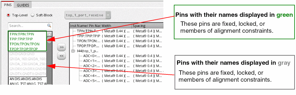 The entries are expressed as termName:pinName:figName because the pin figure is the physical entity that you are placing. If a pin has more than two pin figures attached to it, but the pin figures have the same name, they are represented by a single entry in the pin list. Pins that you select in the layout design are automatically selected in the pin browser. Similarly, pins selected in the pin browser are automatically highlighted in the layout design.