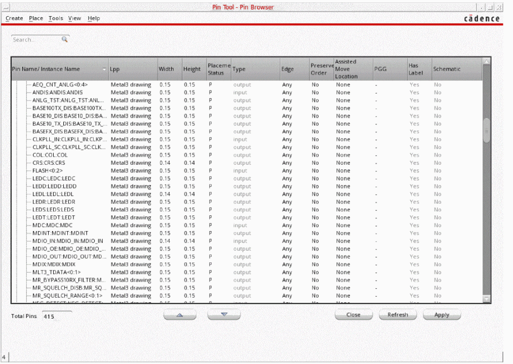 Virtuoso Floorplanner includes the Pin Tool, which is a unified interface for all pin-related tasks, such as creating pins, resizing pins, planning and optimizing pins, editing pin attributes, and setting their location constraints.