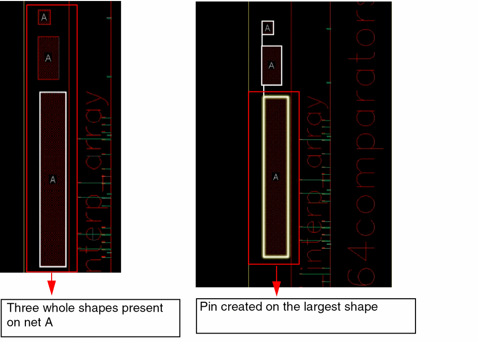 The Auto-Create Pins form lets you search for net shapes in a design and automatically creates a boundary or buried pin on the largest whole shape that is present inside the PR boundary. You can create different pin shapes such as square, rectangle, L-shaped, and path pin. In the following image, three whole shapes of different sizes are present on the same net and on the same layer in the layout design. After running the tool, a pin is created on the largest whole shape.