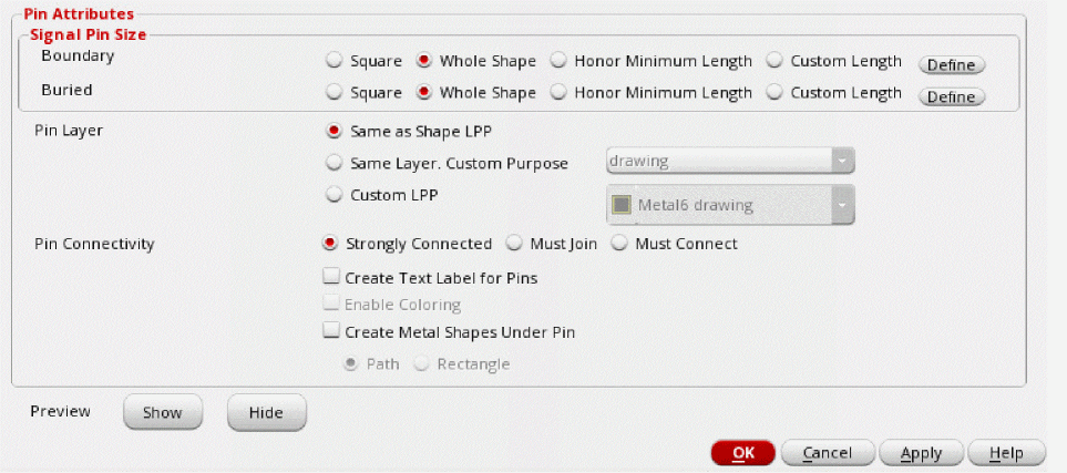 In the Pin Attributes section, set the Signal Pin Size for Boundary and Buried pin shapes to Whole Shape in order to specify the type of whole shape pins to be created - boundary, buried or both.