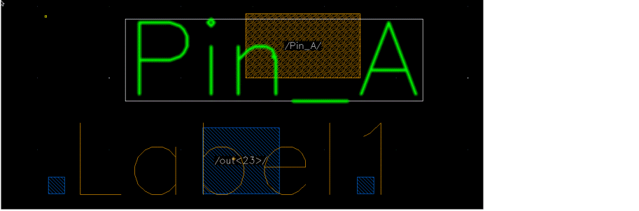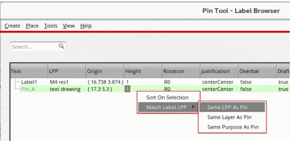 In the following example, when you select Same LPP as Pin for Pin_A, the label layer purpose is updated in the Label browser and displayed in blue.