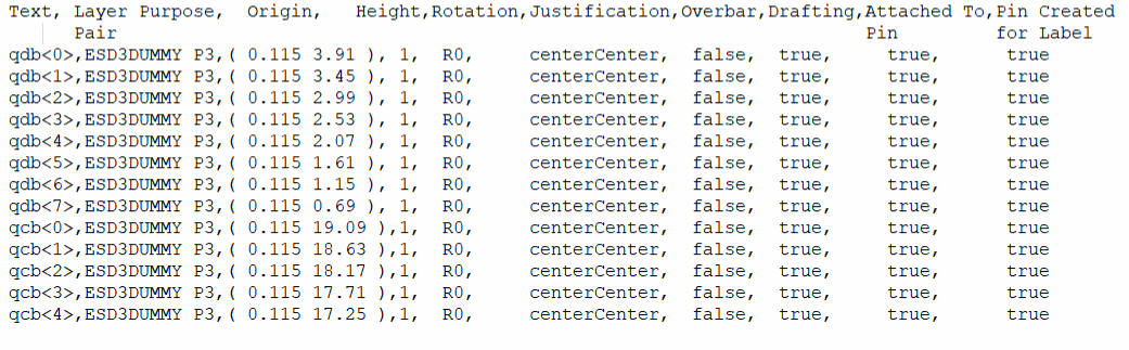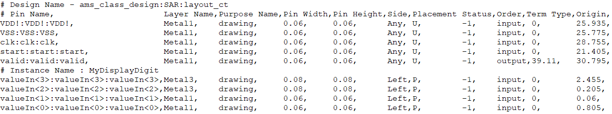 A pin file comprises a set of top level and level-1 pin names and their parameters, such as their layers, purposes, widths, heights, direction, placement status, order, and location, as shown in the following image. The attributes are exported in CSV file format. These pins can be generated in the target layout view and its corresponding instances.