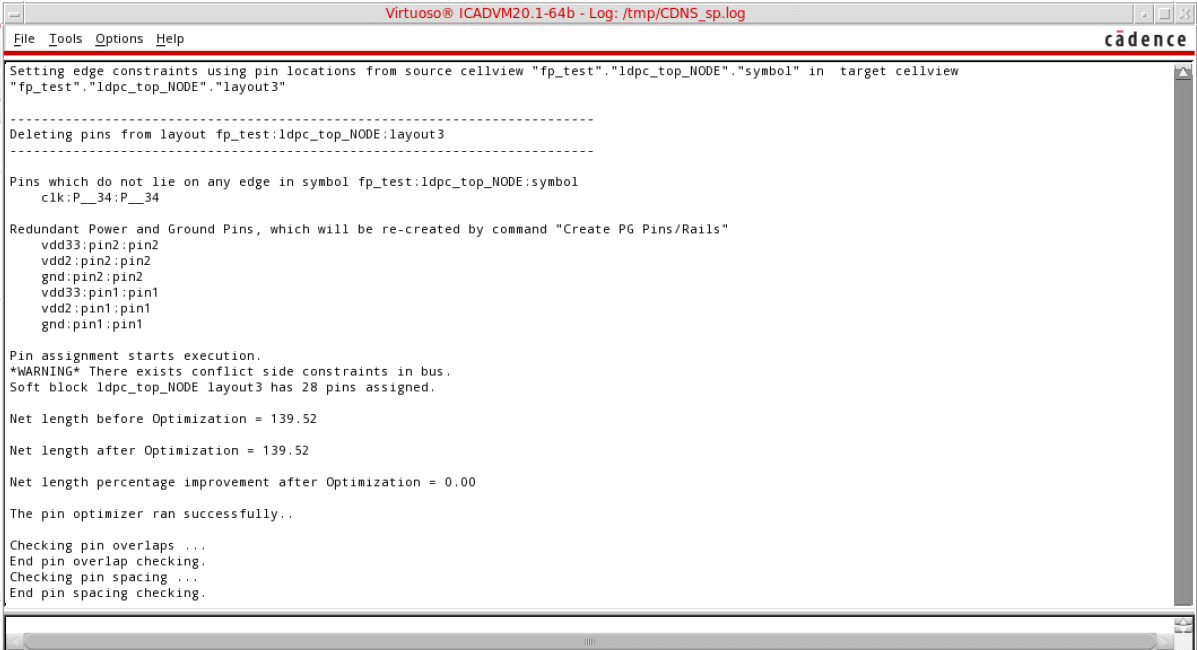 A report is generated in the CIW listing the pins that have been deleted and the pins and rails that have been created. The report also shows pin optimization results.